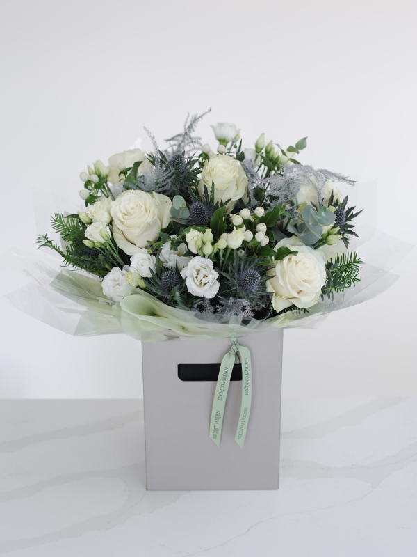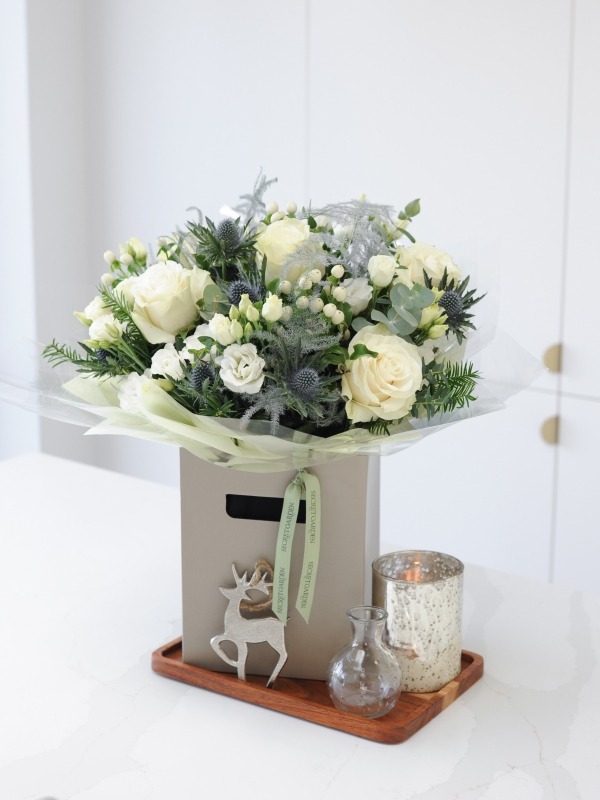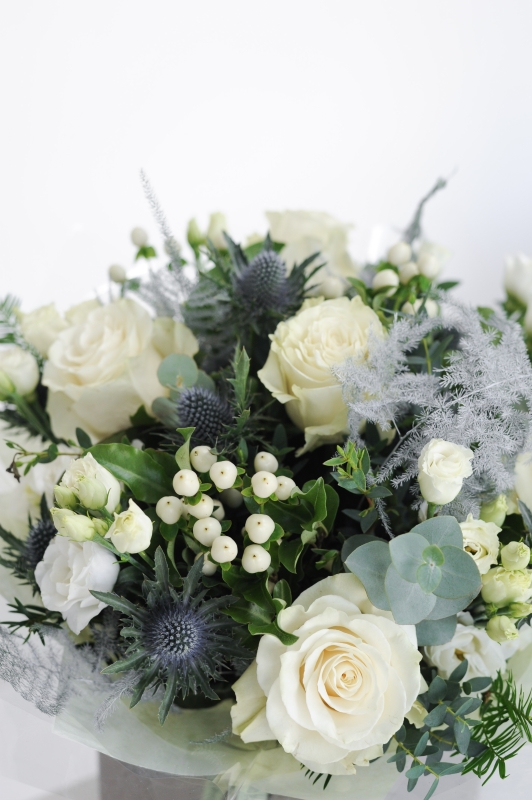 Our 'Winter Wonderland' hand-tied bouquet is designed to add a glittering frosty touch to your decorations. Filled with white and silver blue blooms including roses, lisianthus, thistle and berries along with seasonal foliage.