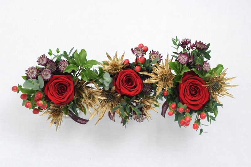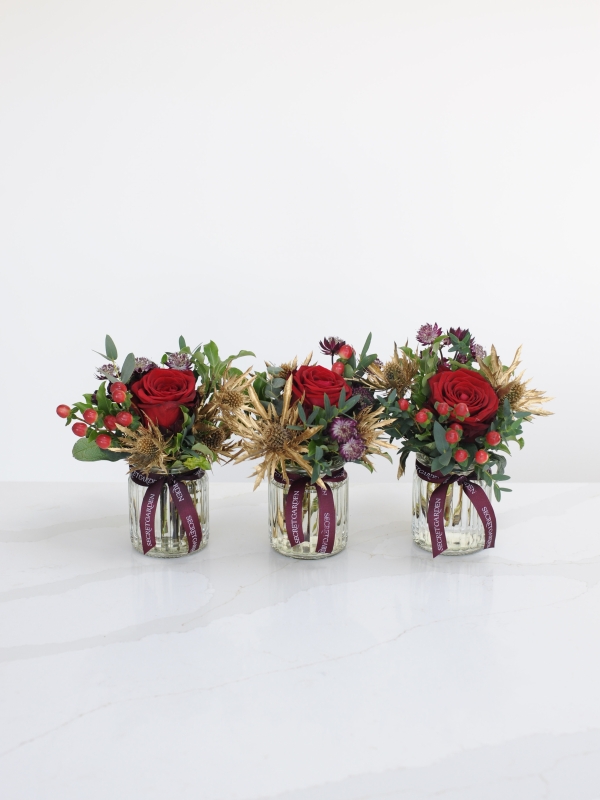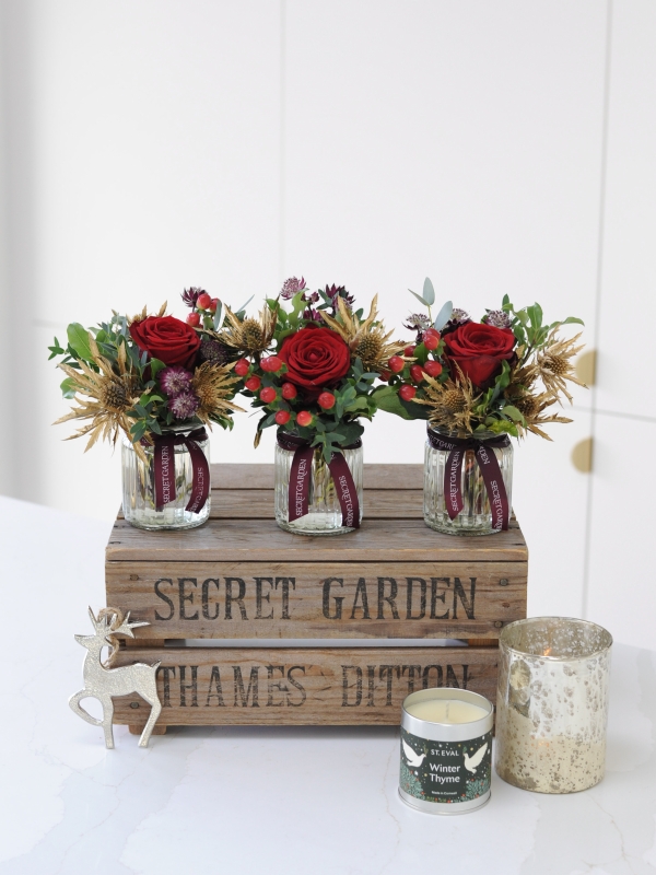 A mini festive treat, our best-selling sweetie jars have had a Christmas makeover! 'We Three Kings' trio of small sweetie jars are filled with deep red and gold blooms including roses, thistle and berries and seasonal foliage.