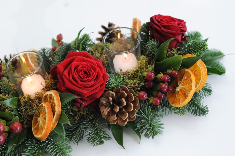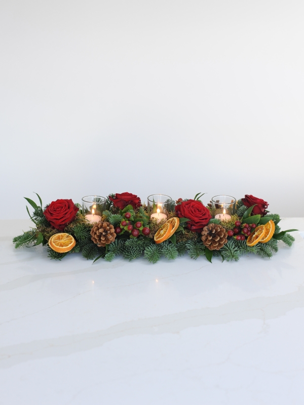 Perfect for a long dining or entry table, our 'Silent Night' table arrangement is available in white or red. Filled with roses, pine cones, orange or lime slices, berries and seasonal foliage, topped with clear glass tea lights.