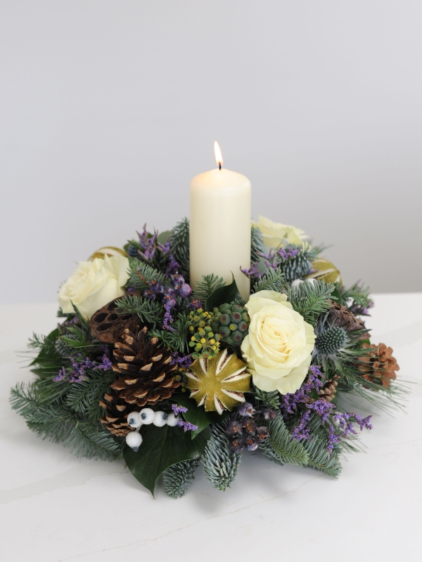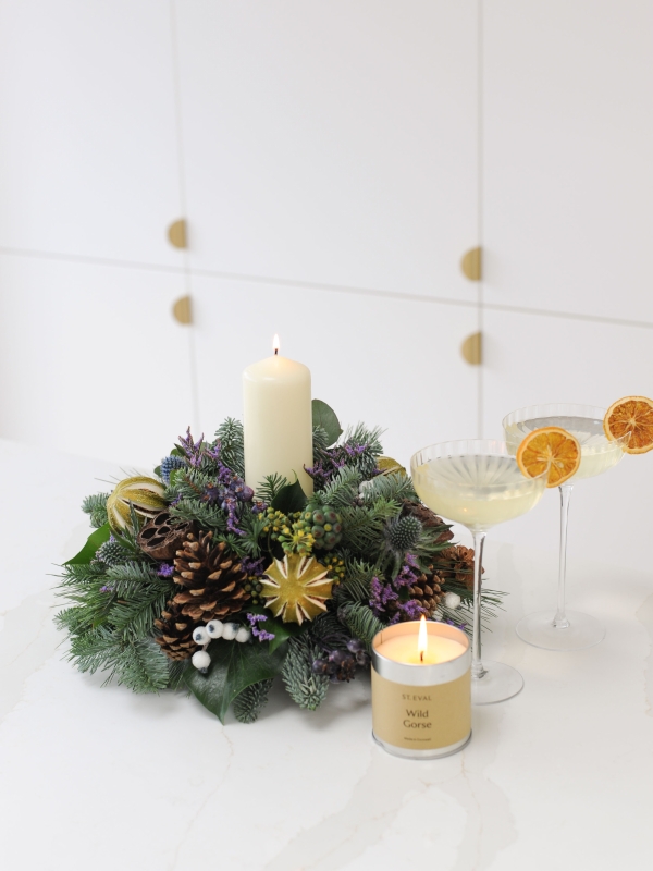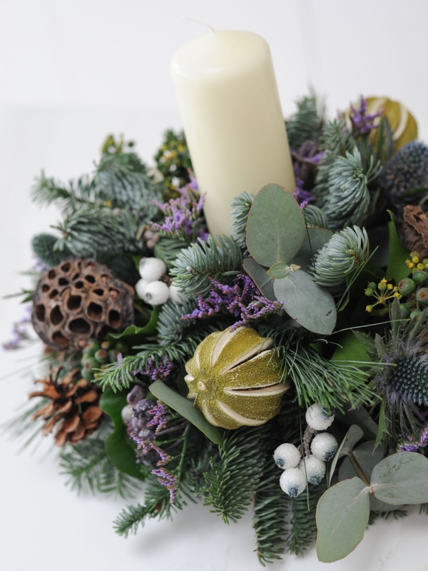 Perfect for a round dining or coffee table, our 'Amazing Grace' table arrangement filled with thistle, limonium, pine cones, limes, berries and seasonal foliage, topped with an ivory pillar candle.